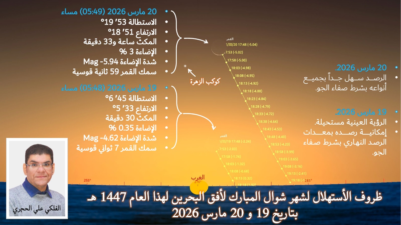 الأحساء زهير بن جمعه الغزال صرح الباحث الفلكي علي الحجري بأن مملكة البحرين تستعد لتوديع شهر رمضان المبارك لعام 1447 هـ الذي سيمتد على طوال ثلاثين يوماً لمعياري الفلكي والرؤية العينية المجردة، فيما تشير الحسابات الفلكية التي أجرها الحجري إلى أن سيطل أول أيام عيد الفطر السعيد في يوم الجمعة 20 مارس 2026 لمعتمدي التقويم الفلكي، فيما يكون يوم السبت 21 مارس 2026 لمعتمدي تقويم الرؤية العينية المجردة، ويأتي هذا التوافق السهل في حسم غرة شهر شوال المبارك نتيجة القيم الفلكية السهلة والواضحة للقمر لأفق البحرين والمنطقة، والتي تحقق شروط تحديد غرة شهر سواء وفق الحساب الفلكي أو الرؤية العينية المجردة بشكل مباشر.