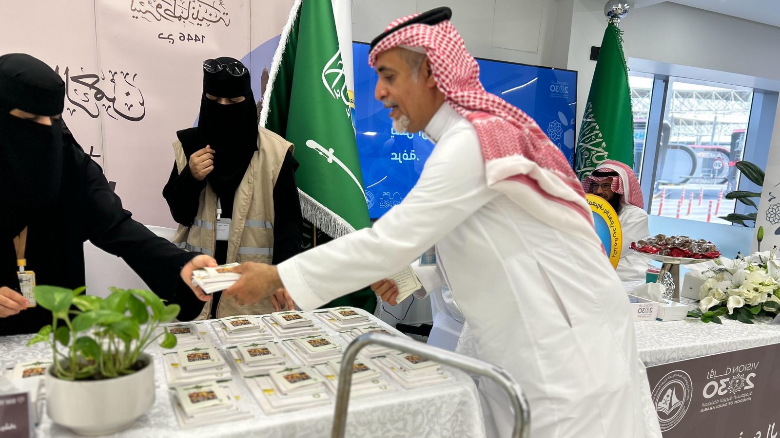 وقدّم منسوبو ومنسوبات الوزارة المشاركون في الاستقبال القهوة السعودية والتمور ومجموعة مختارة من الحلويات، في مشهد يجسّد الكرم السعودي الأصيل ويُعبّر عن التقدير الكبير لضيوف الرحمن منذ لحظة وصولهم.