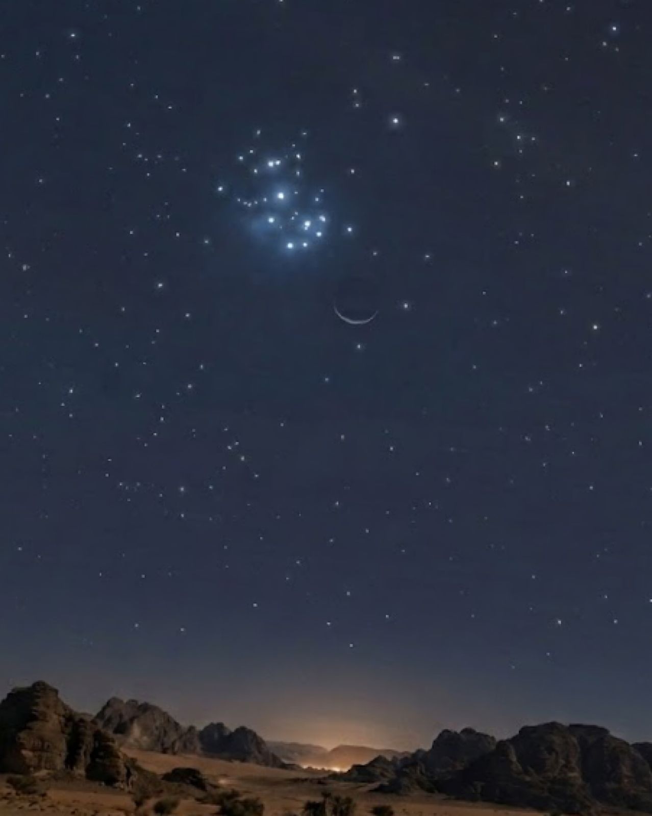 سيظهر هلال القمر الصغير المتزايد بعد أيام قليلة من المحاق في طوره الأول كخيط رفيع مضيء يشير إلى بداية الشهر القمري، حيث يقترب بصرياً من عنقود الثريا المعروف أيضاً باسم “الشقيقات السبع” بمسافة زاوية قصيرة بينهما ما يجعلهما يظهران معاً في مجال رؤية المناظير أو عدسات التصوير ذات البعد البؤري المتوسط.