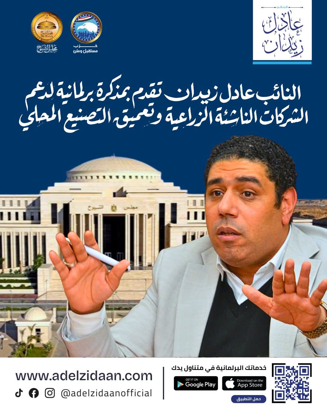 واختتم النائب عادل زيدان تصريحاته بالتأكيد على أن المذكرة تتضمن رؤية واضحة للدور التشريعي والرقابي المطلوب خلال المرحلة المقبلة، بما يشمل مراجعة التشريعات المنظمة لريادة الأعمال الزراعية، وتبسيط إجراءات التراخيص، ودعم التحول الرقمي، معربًا عن ثقته في أن تبني هذه المقترحات سيسهم في زيادة مساهمة القطاع الزراعي في الناتج المحلي، وخلق فرص عمل مستدامة، وتعزيز الأمن الغذائي والاستقرار الاجتماعي.