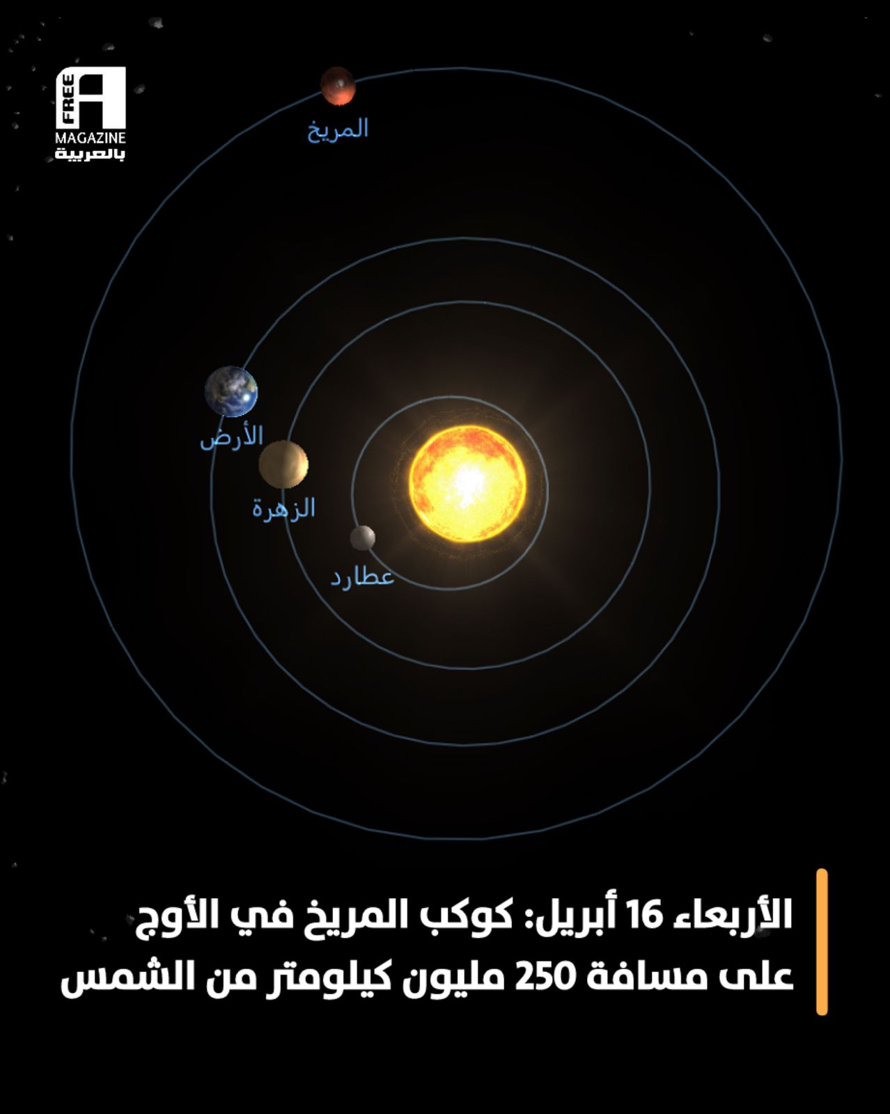 يصل كوكب المريخ اليوم الأربعاء 16 أبريل 2025 إلى أبعد نقطة له عن الشمس (الأوج)، وذلك على مسافة تُقدّر بنحو 250 مليون كيلومتر، عند الساعة 11:38 مساءً بتوقيت مكة المكرمة (08:38 مساءً بتوقيت غرينتش).