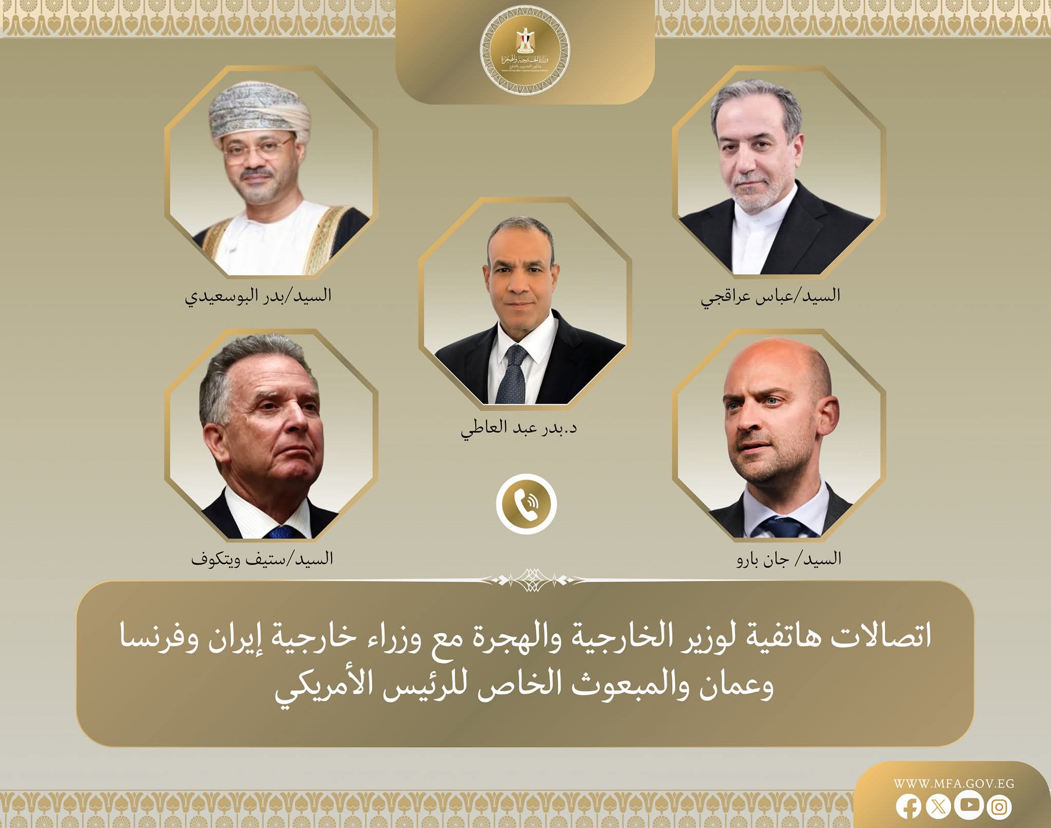 توجيهات من رئيس الجمهورية، جرت اتصالات مساء أمس ١٤ يناير بين د. بدر عبد العاطي، وزير الخارجية والهجرة وشئون المصريين بالخارج، وجان-نويل بارو، وزير أوروبا والشئون الخارجية الفرنسي، وبدر بن حمد البوسعيدي، وزير خارجية سلطنة عمان، وعباس عراقجي، وزير الخارجية الإيراني، وستيف ويتكوف، المبعوث الأمريكي الخاص للشرق الأوسط.