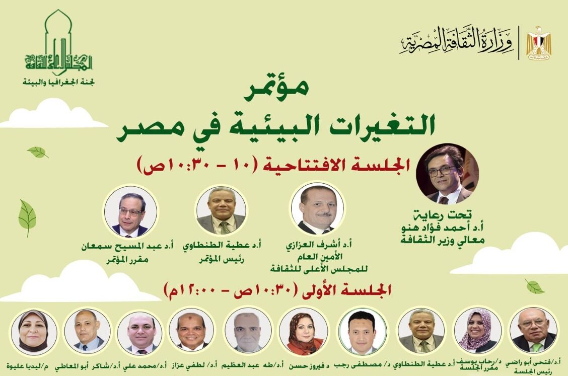 تحت رعاية الدكتور أحمد فؤاد هنو وزير الثقافة، والدكتور أشرف العزازي الأمين العام للمجلس الأعلى للثقافة، يطلق المجلس الأعلى للثقافة مؤتمر: “التغيرات البيئية في مصر”، والذي تنظمه لجنة الجغرافيا والبيئة بالمجلس برئاسة الدكتور عطية الطنطاوي مقرر لجنة الجغرافيا والبيئة، والذي يقام في تمام الساعة التاسعة صباح يوم الأربعاء الموافق ١٥ أكتوبر الحالي وتمتد الفعاليات حتى الخامسة والنصف مساء، بمقر المجلس الأعلى للثقافة باحة دار الأوبرا المصرية.