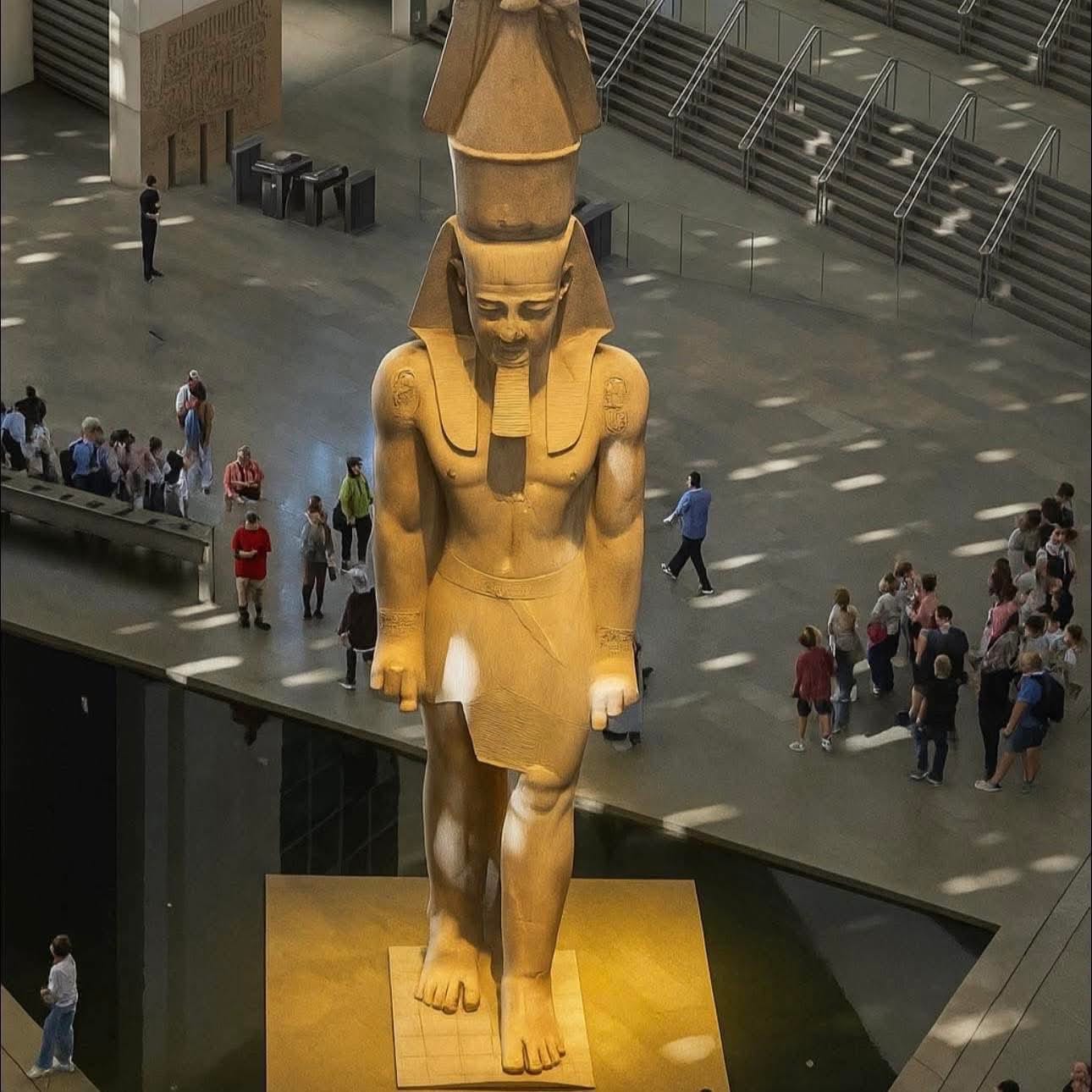 تمثال رمسيس التاني، الملك العظيم اللي حكم مصر لأكثر من ستين سنة وبنى أعظم المعابد والآثار، كان من كام سنة مرمي في ميدان رمسيس وسط الزحمة والهرجلة والعربيات. كان واقف هناك والدنيا بتدور حواليه، والناس ماشية في حالها، والمتسولين بينامو جنبه. ولا كان في حد بيجي من بره مصر مخصوص علشان يتصور معاه، ولا كان ليه الاعتبار اللي يستحقه.