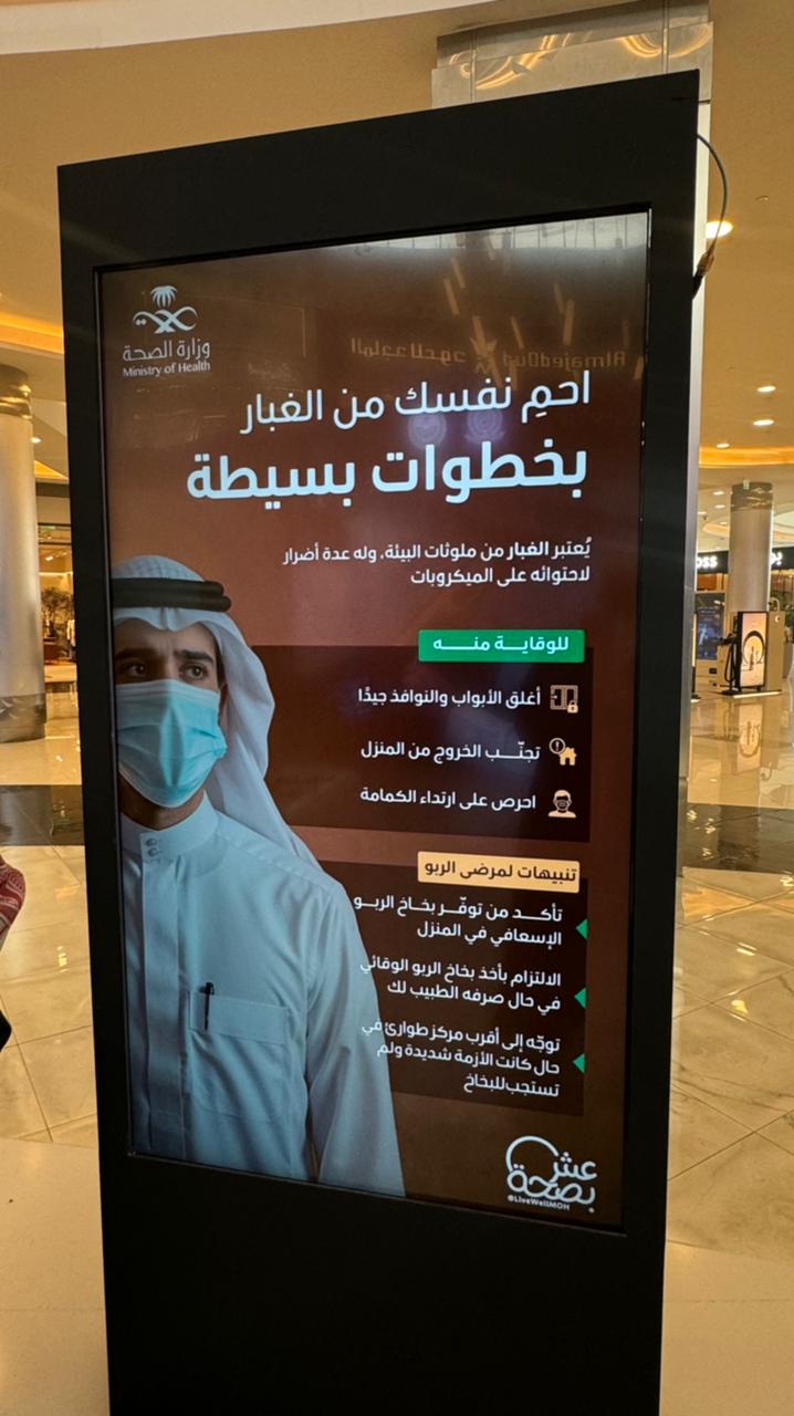 كما يعرض فرع وزارة الصحة بالرياض ضمن جناحه المشارك في معرض برنامج نشر الوعي بالظواهر الجوية عدداً من الرسائل التوعوية والتثقيفية ضمن هذا الاطار .