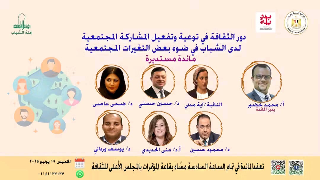 تحت رعاية الدكتور أحمد فؤاد هنو- وزير الثقافة، وإشراف الدكتور أشرف العزازي- الأمين العام للمجلس الأعلى للثقافة، والدكتورة منى الحديدي- مقرر لجنة الشباب بالمجلس، تقعد مائدة مستديرة بعنوان: “دور الثقافة في توعية وتفعيل المشاركة المجتمعية لدى الشباب.. في ضوء بعض التغيرات المجتمعية”؛ والتي تنظمها لجنة الشباب، في تمام السادسة مساء الخميس ١٩ يونية ٢٠٢٥؛ بقاعة المؤتمرات بالمجلس الأعلى للثقافة.