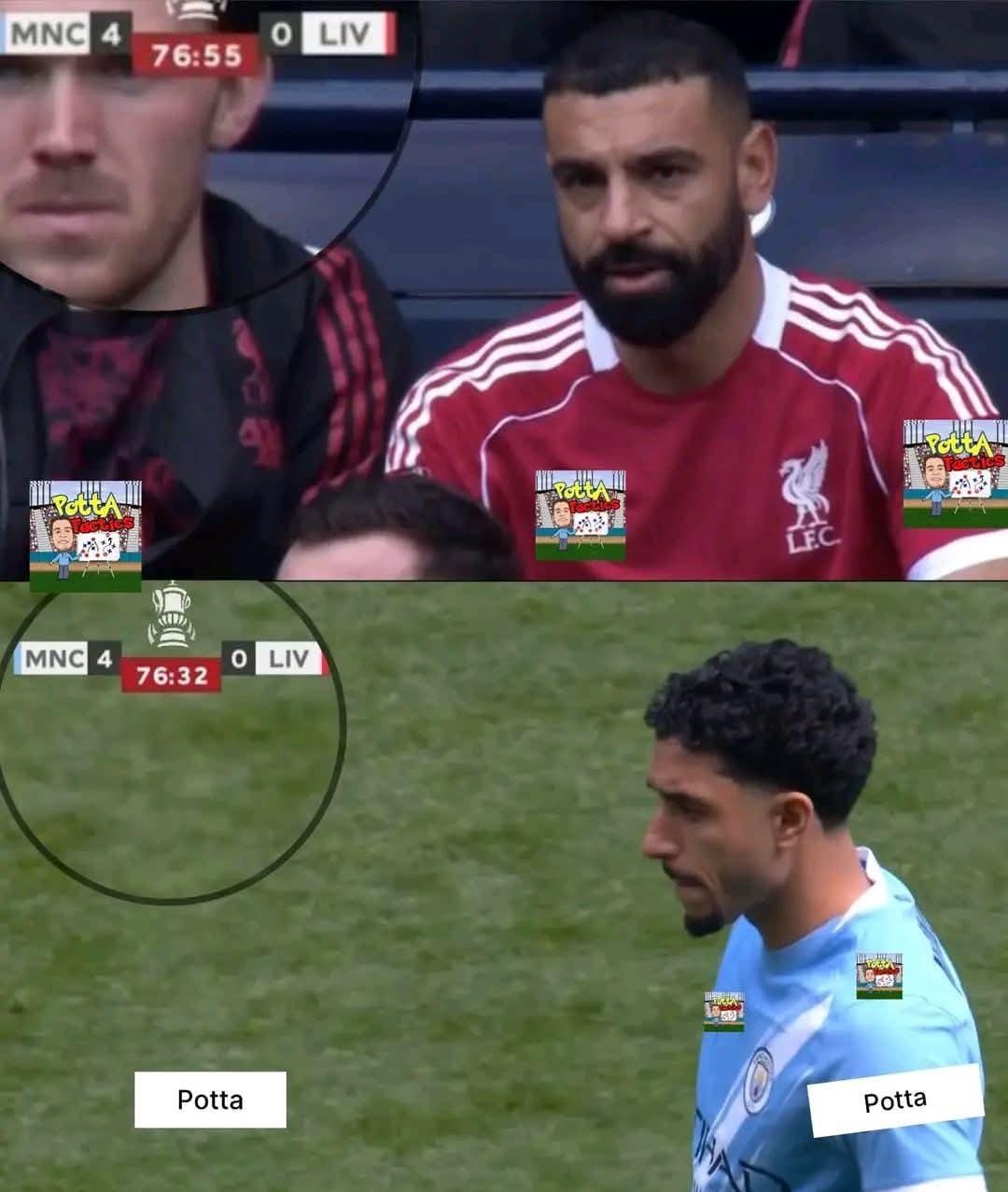 مشهد خروج صلاح و نزول مرموش في نفس اللحظه بيجسد واقع داخلين عليه ، صلاح خلاص هيمشي من ليفربول السنة دي و هيمشي من انجلترا كلها بعد 9 مواسم متتاليه ساهم فيهم ب 21 هدف في 25 مباراة امام مانشيستر سيتي !