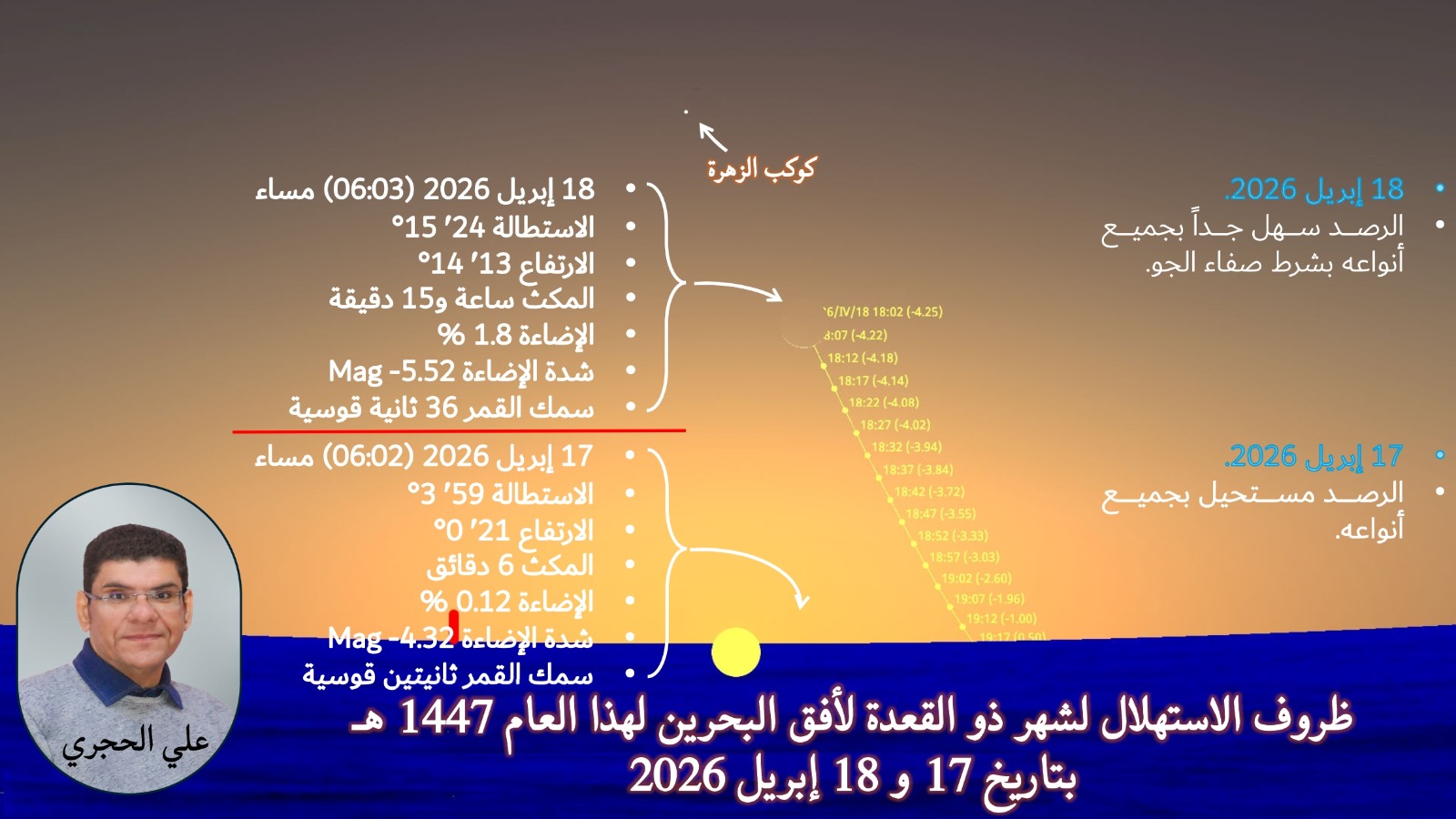 قال الباحث الفلكي علي الحجري أن هلال شهر ذو القعدة لهذا العام 1447 هجري سيكون سهلا جدا ومناسبة للرصد بجميع أنواع الرصد والعين المجردة في حالة صفاء الجو يوم السبت القادم بتاريخ 18 إبريل الجاري.
